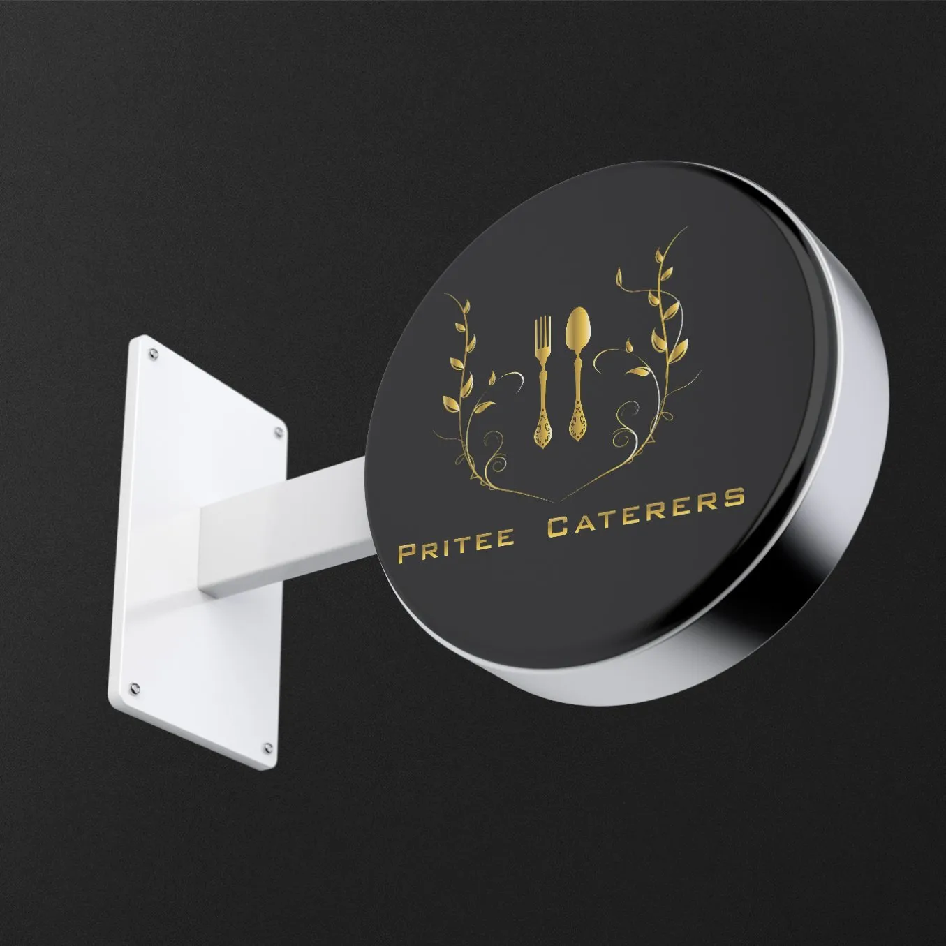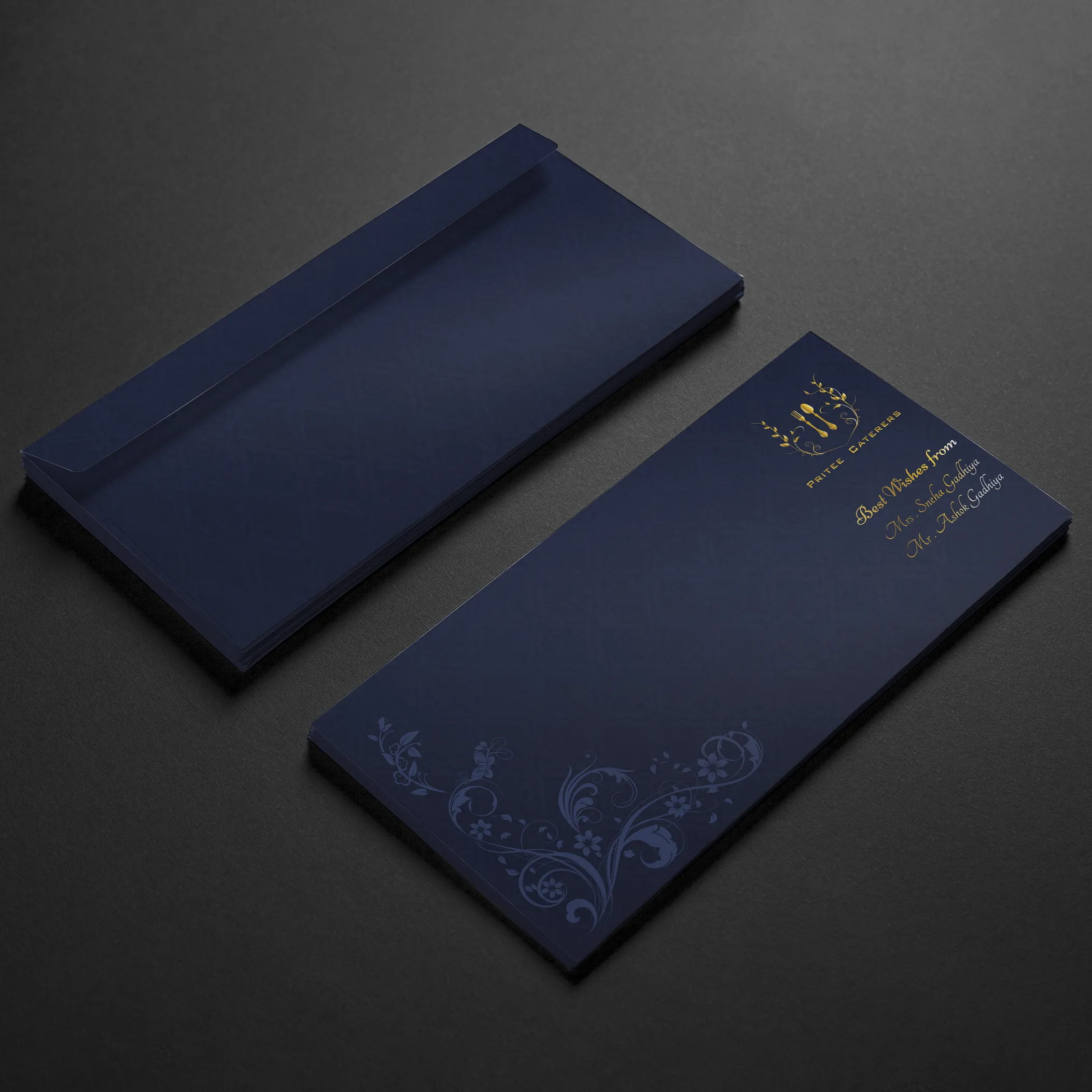 The design philosophy centered on translating culinary sophistication and event excellence into refined visual language communicating luxury, professionalism, and celebration. The distinctive logo features an elegant monogram merging fork and spoon utensil silhouettes with botanical leaf flourishes—symbolizing both culinary expertise and refined dining experience. The navy and gold color palette evokes premium positioning, sophisticated dining, and celebratory grandeur while maintaining professional corporate appropriateness. The design language employs refined botanical ornamentation, geometric framing elements, and classical typography establishing premium catering brand identity across stationery, signage, and environmental graphics. Dual-color collateral strategy employs navy-and-gold for premium brand communication with white-background complementary materials enabling flexible deployment across diverse event contexts.
